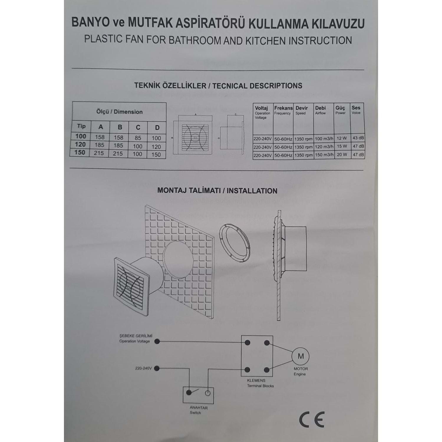 TEKNİK ÖZELLİKLER : BOYUTLAR : (74mm+15mm)89mm x 158mm x 158mm GÜÇ : 15W DEBİ : 90 m3/h ÇALIŞMA GERİLİMİ : 220/240V FREKANS : 50-60 Hz